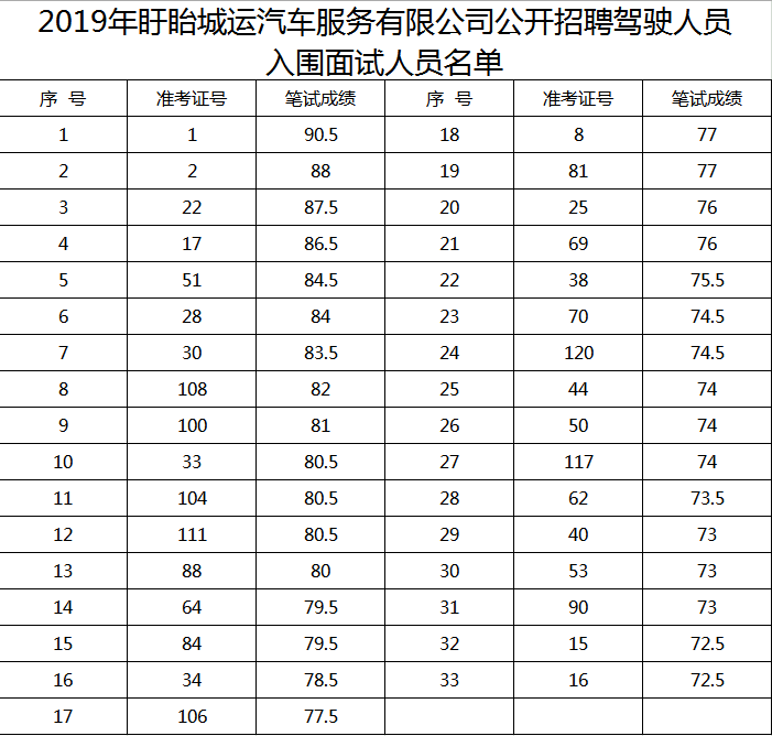 2019年盱眙城運(yùn)汽車(chē)服務(wù)有限公司公開(kāi)招聘駕駛?cè)藛T筆試已于2019年9月10日結(jié)束,考生的筆試成績(jī)已經(jīng)公布。根據(jù)《盱眙城運(yùn)汽車(chē)服務(wù)有限公司駕駛員招聘簡(jiǎn)章》規(guī)定,現(xiàn)將入圍面試人員名單予以公布。面試具體時(shí)間及地點(diǎn)另行通知。??